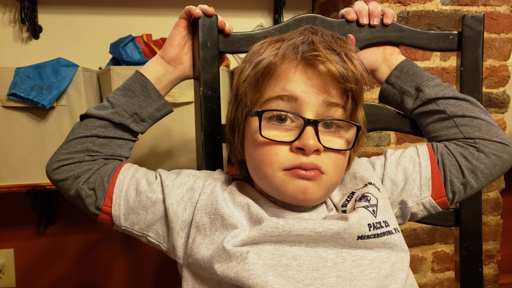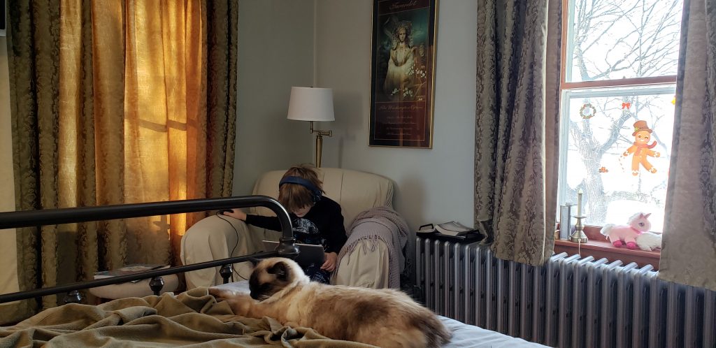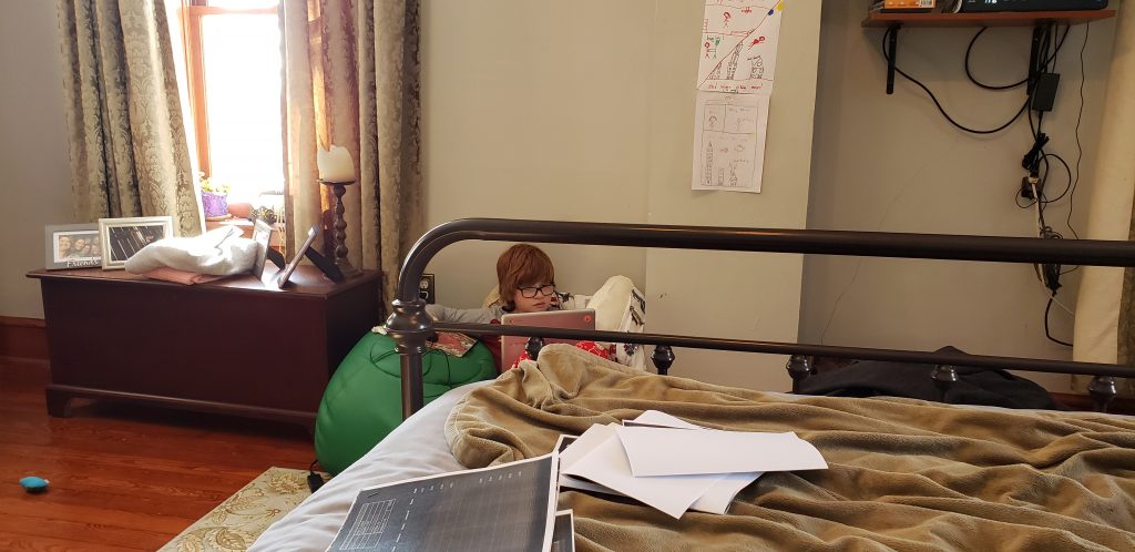 We are all three working in the same room. Not so bad..yet! Actually much easier for me to have them close by when they have questions or need to move on to another subject/google classroom meeting.