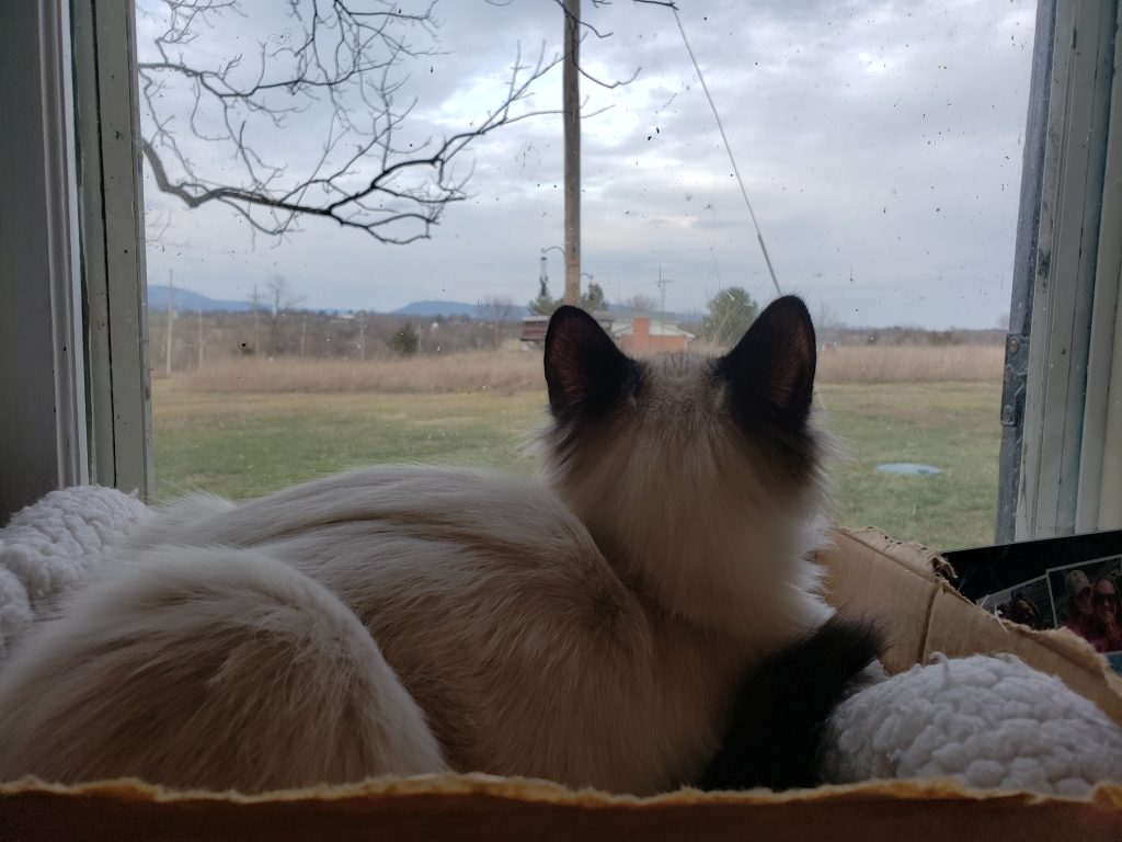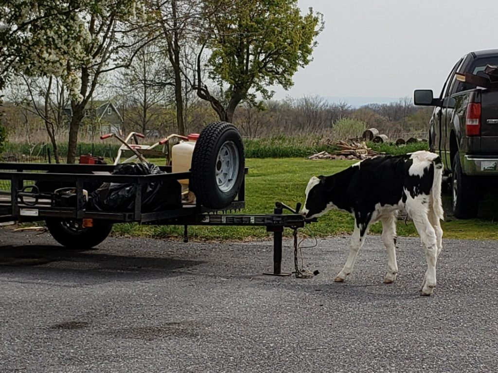 The other week I was on a work video with about 15 other people. I am hanging out, doing my best to look interested…when I hear this BANG and a MOO! I look at the dining room window and what do I see. A calf fall out the back of a trailer, slide across the road, jump up and walk into our yard.